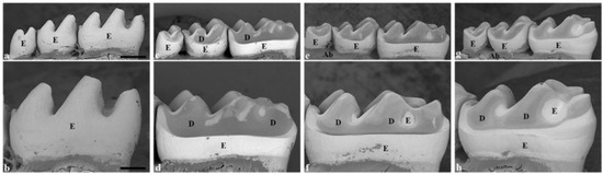 The mandibular molars were dissected and fixed in 70% ethanol. The teeth were then thoroughly cleaned by dissection and gentle brushing under running tap water, followed by air-drying overnight and mounting on brass cylinders using cyanoacrylate glue. They were sputter-coated with platinum and observed using a Tabletop Microscope TM4000Plus (Hitachi, Tokyo, Japan) operated at 10 kV.