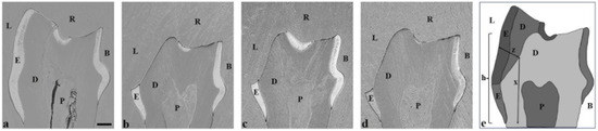 SEM images (a–d) and schematic representation (h) of transversely ground planes of mandibular first molars. SEM images of transversely ground planes of mandibular first molars from negative control (a), positive control (b), fluoride varnish (c), and silver fluoride solution (d). A schematic representation (e) of ground molar planes as a method to compare the experimental groups and to illustrate the measurement techniques used. Z indicates the extent of lingual enamel/dentin loss attributable to erosion. X indicates the line from enamel–cementum junction to eroded dentin surface, which is the point from where “Z” is measured. H represents the lingual tooth height, measured from the enamel–cementum junction to the highest point on the lingual aspect of the tooth. The dimensions shown correlate with the findings presented in Table 1. The bar represents 100 μm in panels (a–d). E = enamel, D = dentin, P = pulp, R = resin, B = buccal side, L = lingual side.