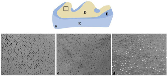 Schematic representation of (a) eroded lingual aspect of the mandibular first molar and SEM images (b–d) of exposed dentin tubules. SEM images of exposed dentin tubules of mandibular first molars from positive control (b), fluoride varnish (c), and silver fluoride solution (d). A schematic representation of the first molar from the lingual side is presented to indicate the area for SEM imaging (a). The bar represents 10 μm in panels (b–d). E = enamel, D = dentin.