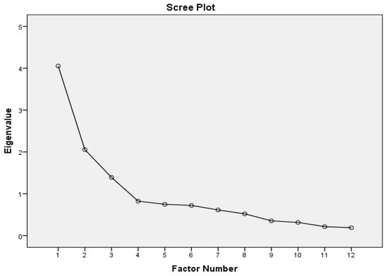 Communalities analysis indicated that some items fell below the recommended threshold of 0.300, indicating a low percentage of variance explained by the common factors. Items 2, 9, and 11 exhibited communalities less than 0.300 but were retained in the analysis due to their significant contribution to the theoretical model. These items are crucial for understanding the construct being measured, and their removal would undermine the content validity of the instrument. Finally, Cattell’s scree plot indicated the presence of three factors (Figure 1).