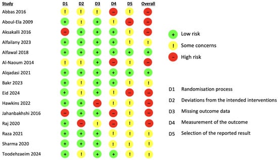 - Sterne, J.A.C.; Savović, J.; Page, M.J.; Elbers, R.G.; Blencowe, N.S.; Boutron, I.; Cates, C.J.; Cheng, H.Y.; Corbett, M.S.; Eldridge, S.M.; et al. RoB 2: A revised tool for assessing risk of bias in randomised trials. BMJ 2019, 366, l4898. [Google Scholar] [CrossRef] [PubMed]