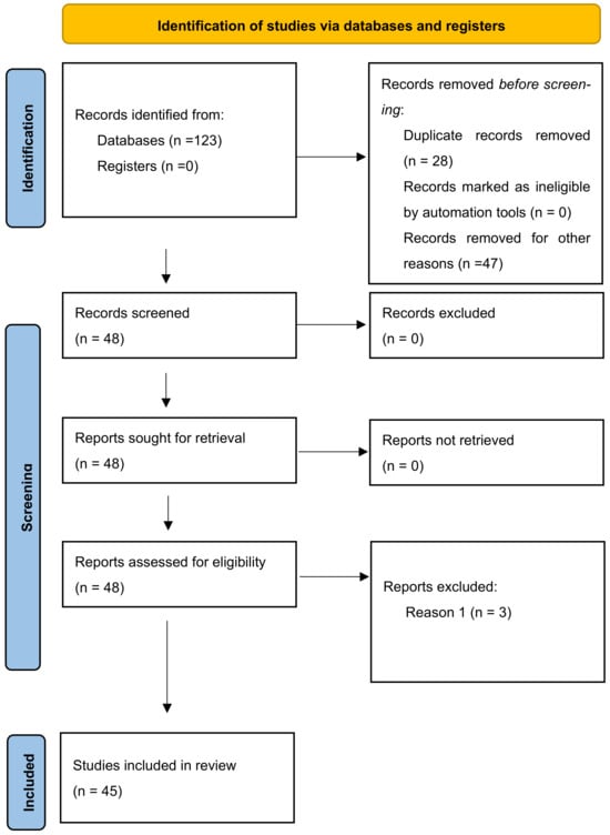 In conclusion, 45 studies met the eligibility criteria and were fully evaluated (Figure 1) [6,7,8,9,10,11,12,13,14,15,16,17,18,19,20,21,22,23,24,25,26,27,28,29,30,31,32,33,34,35,36,37,38,39,40,41,42,43,44,45,46,47,48,49,50].