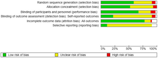 Two authors independently assessed the risk of bias by evaluating the key ones in each included study: selection bias, performance bias, detection bias, attrition bias, and reporting bias. The “Cochrane RevMan” v 5.4 tool was used to develop the following diagrams (Figure 2).