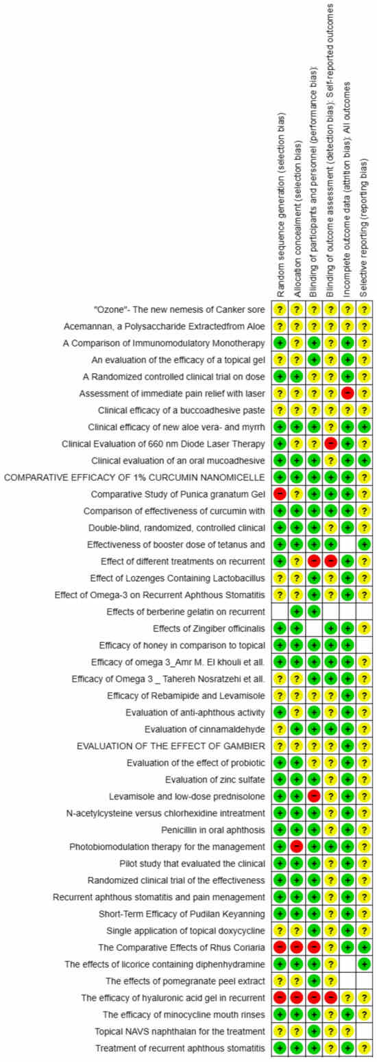Three additional studies were excluded based on the exclusion criteria: they involved aphthous lesions as part of a complex pathological condition, such as Crohn’s disease or Behçet’s disease, where a primary disease was treated with oral ulcers as a secondary effect; patients were undergoing polytherapy or single therapy for other conditions, where the drugs affected the healing of oral ulcers; or the proposed treatment was an adjuvant to a more complex therapy involving multiple agents.