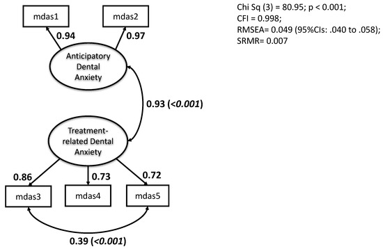 Confirmatory factor analysis of the two latent variable (ovoids) structure of the five MDAS items (rectangles). Latent variables defined by item ‘indicators’. Standardised loadings presented. Double-headed arrows show correlations (with p levels in brackets). Error terms excluded for clarity.