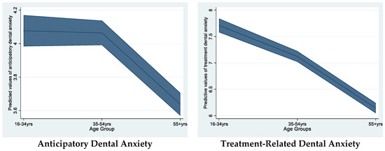 Predicted values (with shaded areas to denote the 95%CIs) of anticipatory (left panel) and treatment-related (right panel) dental anxiety, adjusted for sex across three age groups.