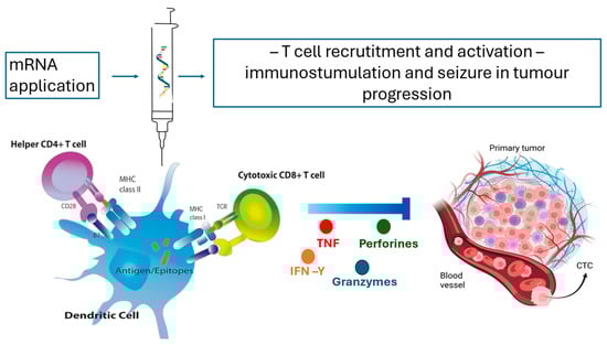 Figure 2. The future of immunotherapy and personalized medicine in oncology using mRNA vaccines—the application of mRNA molecules causes the translation and synthesis of a desired protein which is then expressed on an APC using MHC I and MHC II molecules. Co-stimulation with CD28 and TCR induces a strong CD4 and CD8 T-cell response, resulting in an immunostimulatory antitumor effect and the slowing down of tumor progression.