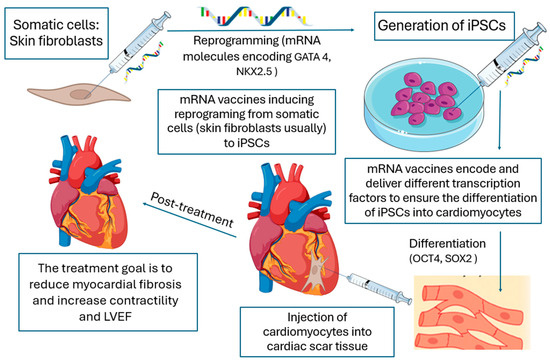 mRNA vaccines are also attracting attention and starting to scrape the surfaces of the promising future of regenerative medicine by encoding various growth factors that, in turn, cause cellular reprogramming and differentiation [54]. A major advantage of mRNA therapies is their safety profile, which avoids the genomic integration risks associated with traditional gene therapies, garnering increased attention [55]. In recent years, two methods have been developed: the mRNA-induced differentiation of induced pluripotent stem cells (iPSCs) and the direct reprogramming of somatic cells [56].