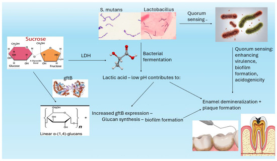 Figure 4. Pathogenesis of dental caries and a place for mRNA vaccines against S. mutans offer a promising prophylactic option and significant long-term savings. S. mutans, the main pathogen causing oral dysbiosis, utilizes polysaccharides such as glucans to produce lactic and other organic acids that favor tooth demineralization and plaque formation. Other bacteria such as Lactobacillus contribute to biofilm formation and communicate through “quorum sensing” mechanisms.