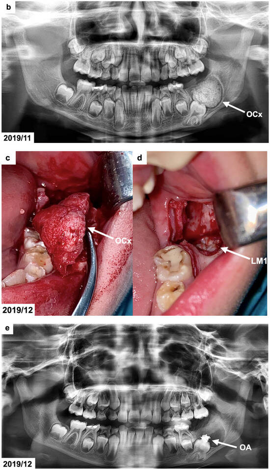 Figure 1b), which was provided by the patient, indicated the presence of a calcified lesion with a radiolucent rim and an adjacent cortical bone layer with a diameter of approx. 3 cm at the distal area of the mandibular first permanent molar. To precisely define the size and position of the tumor, the patient was referred for cone-beam computed tomography (CBCT). The CBCT examination showed a focal area with a calcified mass with the radiodensity of hard dental tissues surrounded by a narrow radiolucent zone on the left side in the molar region of the mandible. The dimensions of the lesion were 25 × 20 × 17 mm. The radiological picture indicated the presence of a complex odontoma. This lesion extended to the lower border of the mandible. The position of the neighboring first permanent molar was altered by the tumor as the tooth was moved downward and mesially. The roots of the affected molar were still developing (app. 2/3 of the final root length). The upper part of the tumor was not covered by the alveolar bone by 20 × 6 mm.