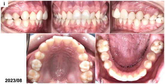 Figure 1g). No pathologies were present on the panoramic radiograph except for the bending of the distal root of the affected molar. The patient has received an activator with an expansion screw to correct his Class II relations and maxillary crowding. In August 2023, the impacted molar tooth erupted into occlusion, and the root development was finished (