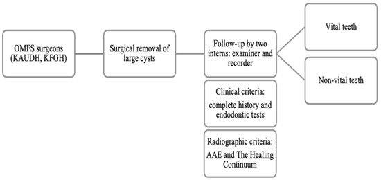 In the retrospective phase, two investigators obtained a list of patients (n = 76) who were diagnosed with cysts in both of the KAUDH and KFGH centers. Electronic preoperative medical records were thoroughly checked, and data were collected and categorized in a self-structured table sheet for each patient. The collected data included age, sex, complete history including medical and dental records, smoking habits, history of symptoms, and teeth involved in the lesion, as well as the endodontic diagnosis. Additional information included the type of surgical intervention (enucleation, marsupialization, or decompression) with timing and complications, and the histopathological diagnosis. Pre- and post-surgical radiographs and follow-up periods were also obtained (Figure 1).