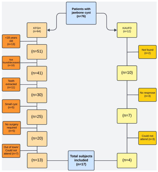 Of the 76 patients (n = 64 KFGH; n = 12 KAUFD), 12 participants were <18 years old and were excluded. Eleven patients had their involved teeth extracted, and five had lesions < 2 cm. Furthermore, 25 patients were not reachable or could not attend the recall appointment, while five were not indicated for surgical treatment. Finally, 17 patients with 63 teeth were included in the study (Figure 2).