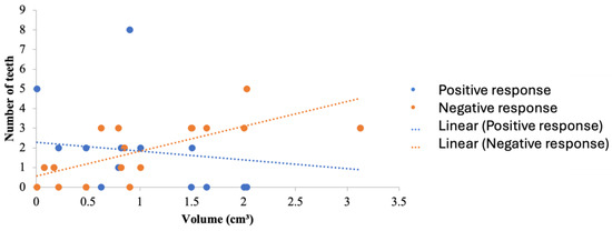 The dimensions of the cysts, as measured by ellipsoid volume, ranged between 0.008 and 3.126 cm3. In this study, it was found that the larger the bony defect, the more the response to sensibility testing may be compromised. Four out of seventeen patients retained the vitality of all of their involved teeth; however, it can be noted that all of their bony defects were less than 1 cm3 in size. However, the teeth involved in cystic lesions in five patients did lose their response to sensibility testing; the cavity size was greater than 1 cm3 in four out of five patients. Mosquera-Barreiro et al. [36] found that there is a constant relation between age and lesion size, reporting that the older the patient, the larger the lesion would be [36]. In this study, it was shown that young patients had the smallest defect size (20 years old), had the longest follow-up period (32 months), and all teeth involved in the cystic lesion retained their vitality.