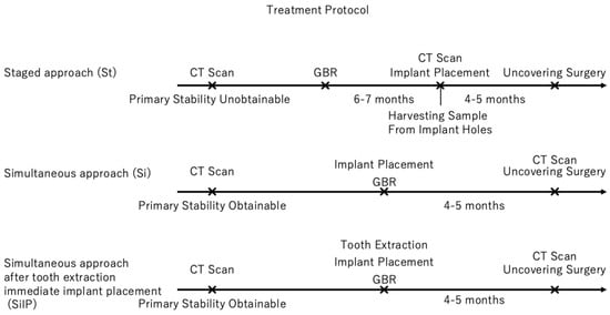 Treatment planning was performed using pre-operative cone beam computed tomography (CBCT) data and wax-up study models. The treatment protocol is illustrated in Figure 1. In three patients with insufficient bone volume, implant placement was performed using a staged approach (St) following the GBR technique (residual bone was less than 1/3 of the length of the implant). Sufficient bone was available in the other three patients for ensuring primary stability following implant placement in the edentulous area. Therefore, these treatment plans were designed to simultaneously perform GBR and implant placement (Si) (residual bone was more than 1/3 of the length of the implant). The other four patients had sufficient bone for ensuring primary stability of the implant placement; however, loss of buccal bone wall was observed following teeth extraction. In these cases, alveolar ridge augmentation beyond the bone housing was necessary; therefore, simultaneous GBR technique with immediate tooth extraction (SiIP) was planned (residual bone after extraction was less than 1/3 of the length of the implant). In all cases, bone-augmentation therapy was performed using CA (Cytrans Granules®, M size; GC Corporation, Tokyo, Japan) with P(LA/LC) membranes.