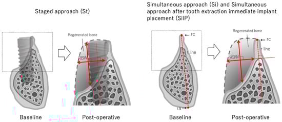 In every case, dimensional changes in the augmented bone tissue were measured baseline and post-operative CBCT data. For clinical measurement, implant placement simulations were performed using computer simulation software (Landmark system, iCAT, Osaka, Japan), and the pre-surgical bone width (pre-BW) was measured on the pre-surgical CT image. Subsequently, in the case of St, post-surgical CT was performed to fix the implant positions 6 months after GBR. The simulated implant position on the pre-surgical CT image was reproduced on the post-surgical CT image to pinpoint the position of the pre- and post-operative surgical areas, and the post-surgical bone width (Po-BW) was measured. The Po-BW was defined as the longest line perpendicular to the principal axis of the implant in the regenerated bone (Figure 2). In the case of Si and SiIP, two points were decided as the points that were expected to have the least change preoperatively and postoperatively. The point located on the coronal site was designated as rc, and the point located on the apical site was designated as ra. The line connecting rc and ra was designated as the r-line and was used for overlapping the preoperative and postoperative CT images. The CT images were manually overlapped, and the determination and confirmation of the same site was performed by a different measurer. The regenerated bone width (RBW) was calculated at each treatment site (Table 2). In other cases, post-surgical CT was performed immediately before surgery. Pre- and post-operative CT images were overlapped using anatomical characteristics such as residual teeth and bone form. Following Po-BW measurement, including and excluding the implant diameter, the RBW was calculated using overlapped CT images (Figure 2).