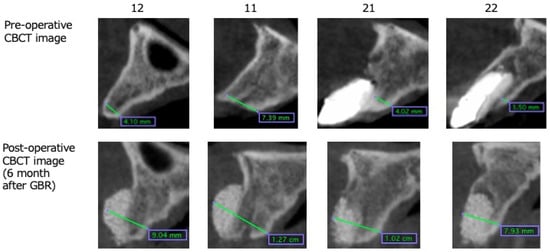 Figure 4. Comparison of the pre- and post-operative cone-beam computed tomography crosscut image. In the 12 and 11 sites, bone volume was augmented nearly 5 mm beyond the bone housing, and in the 21 and 22 sites, extraction sockets were filled regenerated bone.