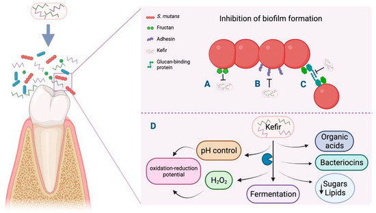 Kefir is involved in the inhibition of glucosyltransferase, which encodes fructan, the binding site for S. mutans (A), and in the reduction in the expression levels of genes that regulate the synthesis of binding proteins (adhesin and glucan), thus preventing bacterial aggregation and biofilm formation (B and C), respectively. Factors in the development of caries such as pH control and the production of diverse metabolites are affected by kefir in the process of fermentation. (D) The figure was created with BioRender.com.