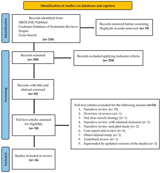 A flow diagram reporting the screening and selection of studies is presented in Figure 1. The electronic search identified 339 papers in total, and after duplicates’ removal, 300 studies remained. Applying the inclusion criteria, 50 articles were screened. After manual screening of the title and abstract and full text, 34 studies were excluded, and the full-text of 16 articles was analyzed. Table 1 reports the excluded studies and the reasons for the exclusion.