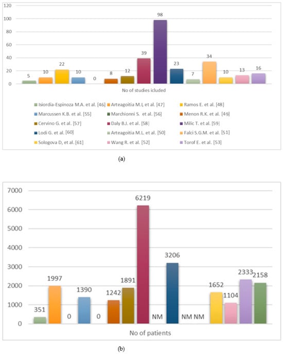 (a) Distribution of included RCTs across systematic reviews. (b) Number of patients enrolled in included RCTs [46,47,48,49,50,51,52,53,55,56,57,58,59,60,61].