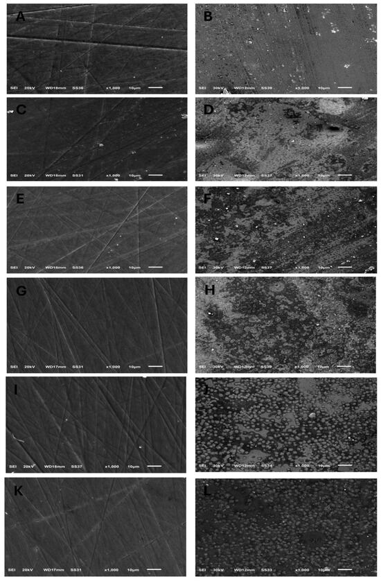 SEM images (×1000) showing surface topography of all tested ceramic groups before and after exposure to acidic challenge; (A,B) IPS e.max CAD, before and after acid exposure, respectively. (C,D) IPS e.max Press, before and after acid exposure, respectively. (E,F) GC LiSi Initial CAD, before and after acid exposure, respectively. (G,H) GC LiSi Initial Press, before and after acid exposure, respectively. (I,J) Cerec Tessera CAD, before and after acid exposure, respectively. (K,L) Celtra Duo Press, before and after acid exposure, respectively.