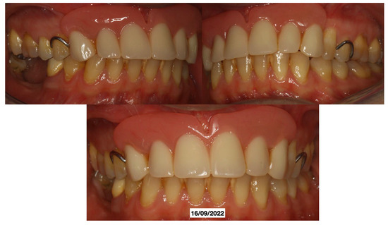Just two weeks later, a rapid worsening was observed (documented with periapical intraoral X-rays) of the elements (13-12-23), which led to their necessary extraction (May 2022), with decontamination of the alveoli, with the beginning of a reabsorption process involving 14-15-16-46-47 (March 2022) with delivery of a removable partial prosthesis (Figure 5).