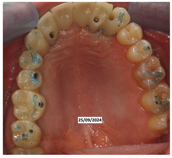 In June 2024, the implants were inserted in areas 16 and 17. Three months after the insertion of the last implants in 16-17 (4.2 × 10 mm and 4.2 × 8 mm, Biotech Dental, Allée de Craponne, Salon de Provence, France), it was possible to proceed with the digital impression-taking to proceed with a temporary prosthesis in PMMA (Figure 9) after a radiographic control (Figure 10).