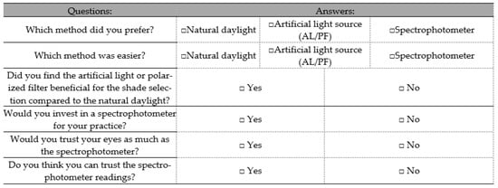 During the last step of the examination, all participants carried out the shade matching using a spectrophotometer [20,21]. This measurement served as a comparative shade of the examined natural tooth. This procedure also served to evaluate whether spectrophotometers enhance students’ understanding and ability to accurately determine tooth shade. According to the manufacturer’s instructions, the spectrophotometer was calibrated for each subject by holding the 5 mm probe tip against a calibrated block until the device beeped. The measured tooth shade was accepted when three consecutive identical readings were obtained for each tooth [19]. For the instrumental shade measurement, the middle third of the labial surface of the maxillary central incisor was selected to best represent the tooth shade. Therefore, for each measurement, the instrument was set to “single tooth” mode, and the tip of the spectrophotometer was positioned at a 90° angle, with zero contact distance. The participants recorded their choices on a form before leaving the room [19,22,23]. After completing the two parts of the experiment, participants were asked to complete a questionnaire, the content of which is shown in Figure 3.