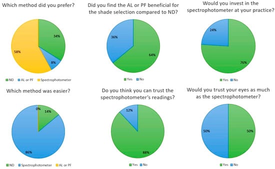 When the participants were asked whether the lighting aids (AL/PF) were beneficial for shade selection compared to ND, 64% of the students responded positively, although they previously indicated that shade selection with lighting aids was not an easy method (Question 2). The participants were informed about the cost of the equipment (AL, PF, and spectrophotometer) and then asked whether they would invest in the equipment for their own practice in the future. It appears that three out of four participants were willing to purchase the devices in the future.