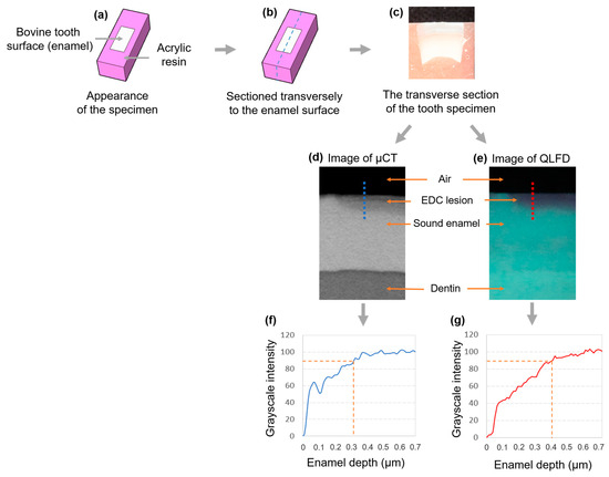 A scheme of this study. The specimens were prepared by embedding them in acrylic resin, exposing the enamel surface of the bovine tooth (a). Subsequently, the specimens were transversely sectioned along the enamel surface (b). µCT images, as shown in (d), and QLFD images, as shown in (e), were obtained from transverse sections of the tooth specimen, such as (c). In the µCT and QLFD images, the dashed lines indicate the regions where grayscale intensity was measured. The grayscale intensity profile was plotted along the path starting from the air portion (completely black), passing through the enamel surface and the EDC lesion, and reaching the sound enamel region. The lesion depth was assessed based on the grayscale intensity thresholds of 90% and 95% in the grayscale intensity profile (f,g). Additionally, the blue dashed and solid lines represent µCT, while the red dashed and solid lines correspond to QLFD.