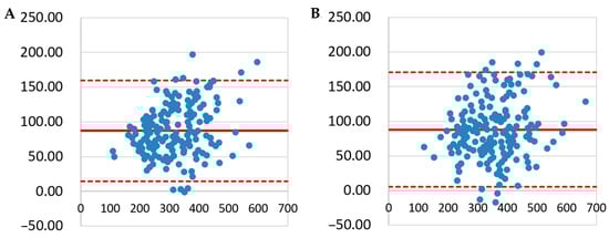 A Bland–Altman analysis of LDµCT and LDQLFD measurements. (A) A Bland–Altman plot of LDµCT and LDQLFD at the 90% threshold. (B) A Bland–Altman plot of LDµCT and LDQLFD at the 95% threshold. The solid red line represents the mean difference between the two methods, while the dashed red lines indicate the 95% limits of agreement (LOA). In (A,B), the majority of data points fall within the LOA, confirming a high level of agreement between LDµCT and LDQLFD at both the 90% and 95% thresholds.