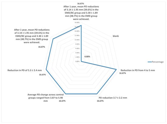 | Pietruska et al. [31] | 2012 | Randomized control trial | 24 patients | 1, 2, and/or 3 walls | 12 months | EMD+ BCP vs. EMD alone | No clear results | PD reduction of 4.7 ± 0.8 mm | CAL gain of 10.4 ± 1.3 mm | ||