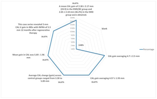 | Mueller et al. [12] | 2013 | Meta-analysis | 1, 2, and/or 3 walls | Intrabony depth ≥ 3 mm | 12 months | Regeneration Connective tissue adhesion Osseous repair | Significant results when using EMD | Mean PD reduction of 4.05 mm | Mean CAL gain of 3.04 mm | ||