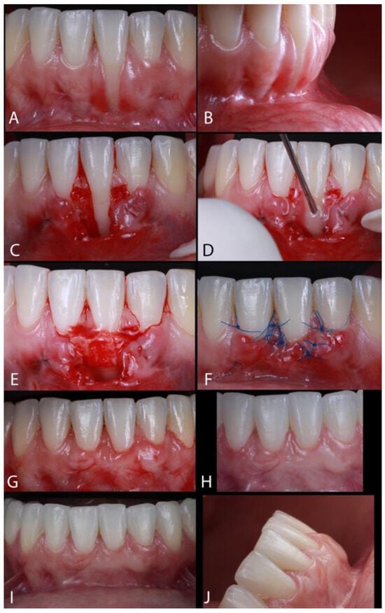 (A,B) Gingival recession type 1 (RT1). (C) A horizontal incision was made at the affected tooth’s mesial and distal papillae at the CEJ, and a second divergent incision extended from the CEJ of the adjacent teeth (mesial and distal) to the midpoint of the recession area. (D) Enamel Matrix Derivative (EMD) was applied on the root. (E) The insertion of the subepithelial connective tissue graft (SCTG). (F) The flap was sutured coronally, with polyamide 6/0 suture. (G) The result after 30 days. (H) The result after 6 months. (I,J) Follow-up after 5 years post-operative.