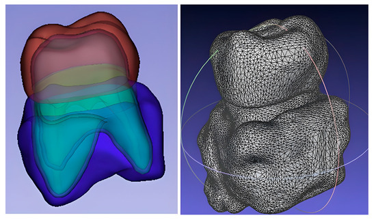 Three-dimensional reconstruction and finite element mesh of the crown model. Different colors represent segmented regions of the tooth and surrounding structures.