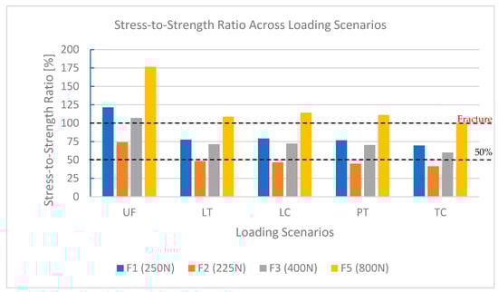 Bruxism-level forces (800 N) further highlighted material performance differences (Figure 5). TC maintained SSR values within safe limits, confirming its suitability for extreme loads. In contrast, LC, LT, and PT exceeded their mechanical limits, which limited their durability under high-stress conditions. UF showed the highest stress levels and SSR values far exceeding 100%, confirming its unsuitability for high-stress applications.