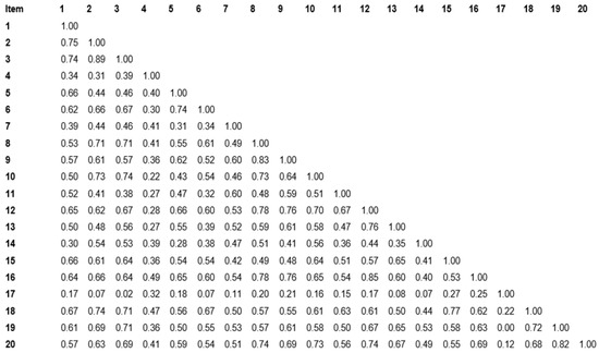 The sample adequacy for factor analysis resulted in a value of 0.834, and Bartlett’s test of sphericity resulted in a highly significant p-value (p < 0.001). The inter-item correlation matrix of the adapted TEAL questionnaire (Figure 1) shows an excellent positive correlation around 0.3, 0.4, and 0.5. However, there were very few values higher than 0.7. According to the results of the reliability analysis, the correlation matrix was positive for further analysis as no negative nor zero correlations denote redundancy [14]. Most values were between 0.3 and 0.6, demonstrating a good correlation among the latent variables. Item-total statistics were analysed to obtain the corrected total-item correlation of the adapted TEAL scale. The results are illustrated in Table 1. Almost all the corrected item correlation values were around 0.7 and above the cut-off value of 0.2. This shows that the homogeneity of the adapted TEAL scale is related to our study sample. The Cronbach’s Alpha value for the total scale was 0.952. All the values of items deleted were below the value of 0.96; the results are shown in Table 2. Nunnly (1994) recommended a reliability estimate of 0.7 [13,14]. The TEAL questionnaire was assessed using Cronbach’s Alpha reliability coefficient. The values in each of the four factors ranged from 0.738 to 0.876 (Table 2).