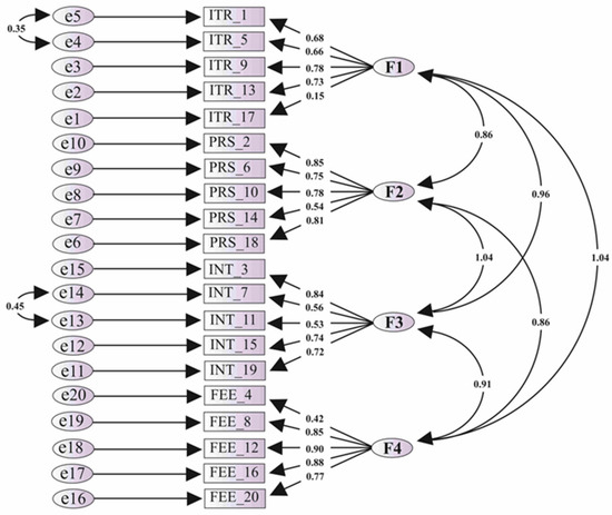 The reliability of the adapted TEAL scale was ensured in terms of Cronbach’s Alpha value calculated separately for all four factors. In the original scale, the internal consistency ranged from 0.83 to 0.88. In the current study, Cronbach’s Alpha values also exceeded the standard criteria of 0.7, which is the cut-off for minimum reliability [14]. If the item is deleted, Cronbach’s Alpha is below the value for the total scale for 17 items, and this shows that by omitting any of these items, the scale statistics will not improve. However, for item four, the Cronbach’s Alpha value if the item was deleted was the same, and it was slightly higher for item 17. This closely resembled the issue of low factor loadings related to the same items in the CFA Path model. In this scenario, deleting items 4 and 17 would improve the scale. However, according to the literature, retaining all the questions in the scale at the validation study is always advisable since the sample is smaller than the field survey [20]. Therefore, it was decided to keep the items for the current study.