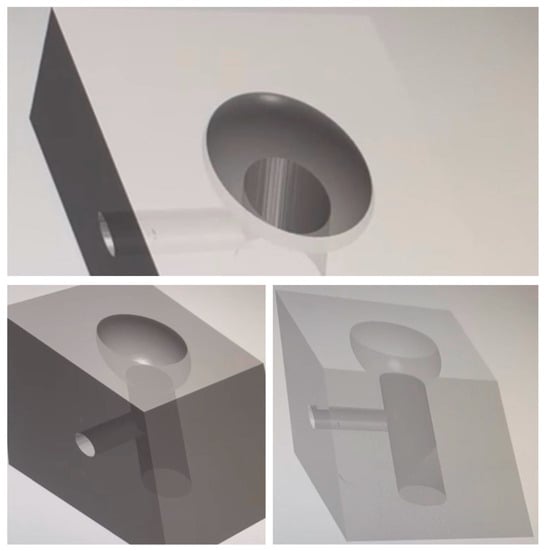 Our study utilized the CAD/CAM procedure to create a solid structure that accurately replicated the implant site affected by peri-implantitis. This structure, which exhibited an open “bowl-shaped” bone defect, as per the classification of L. Vanden Bogaerde (2004), was designed to serve as a model for our in vitro experiments [21]. The three-dimensional bases were crafted from transparent solid resin using the Exocad® design software (Netfabb, vers 7.4.0, Exocad GmbH, Darmstadt, Germany), following the mathematics of the Twincon®—Global D fixture for the implant screwing area. The printing was performed with a FormLab® 3D printer (Sinterit, Krakow, Poland). A channel was incorporated on the lateral surface of the 3D base (Figure 1) to facilitate the connection with the Ximplant machine (LED S.P.A., Latina, Italy).
