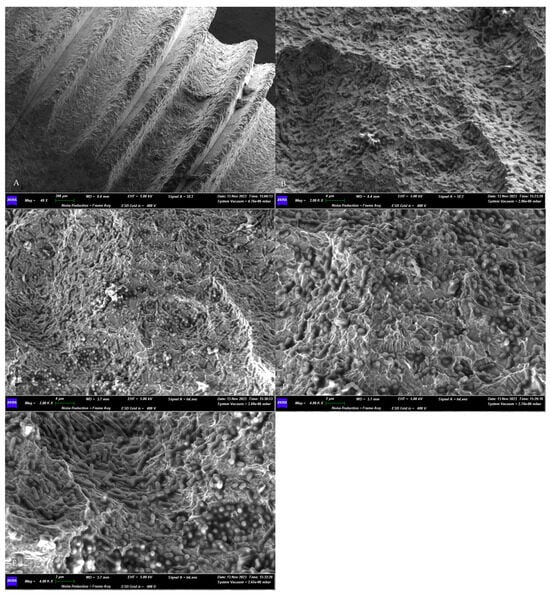 SEM assessment of the microbial growth on contaminated implants surfaces. (A) Panoramic view of the sample. Magnification 40×. (B–E) Higher magnifications (4000× and 2000×) of the biofilm matrix containing numerous microbial communities of different shapes. GEMINI_SEM, Zeiss, Germany. In our previous study [16], the treated surfaces, observed using SEM, appeared without a microbial matrix and microorganisms.