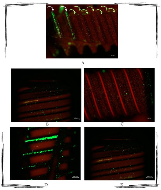 Multipaneled fluorescent microcopy picture showing the most representative observed samples. (A) Image showing how the untreated area (indicated by the white arrows) is full of green light particles, whilst the treated part (indicated by the green arrows) presents the red signal as the most representative. (B–E) Fluorescence-treated samples. All pictures show treated areas, which present both red and green particles, with a marked red signal in all the samples. Zeiss Axio Imager M2. Magnification 10×.