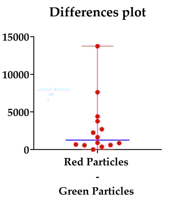 Our null hypothesis was that there would be no difference between the dead bacterial particles and the live bacterial particle numbers. After assessing the normal distribution of the data, the Wilcoxon matched-pairs signed rank test was used to assess the difference between the two considered groups. If the p-value resulted in ≤0.05, the null hypothesis was rejected. GraphPad Prism version 10.4.0 (621) for Windows (GraphPad Software, Boston, MA, USA) was used for the analysis.