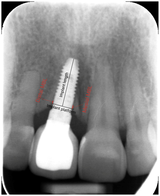 Periapical radiograph showing the measurement of marginal bone level. The known implant length was used to calibrate the radiographic measurements. Then, the mesial and distal marginal bone levels (MBLs) were measured.
