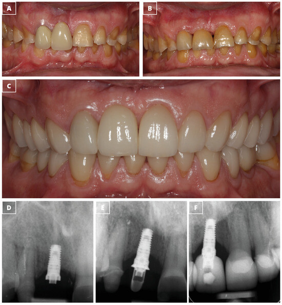 Clinical case treated by a single-unit narrow-diameter implant. (A) Clinical picture showing the baseline condition with missing #1.1 replaced by a fixed prosthesis. (B) The provisional prosthesis. (C) The definitive prosthesis. (D) Periapical radiograph showing the insertion of a 3.3 mm × 7.5 mm dental implant. (E) Periapical radiograph at the implant loading. (F) Periapical radiograph after four years of implant insertion.