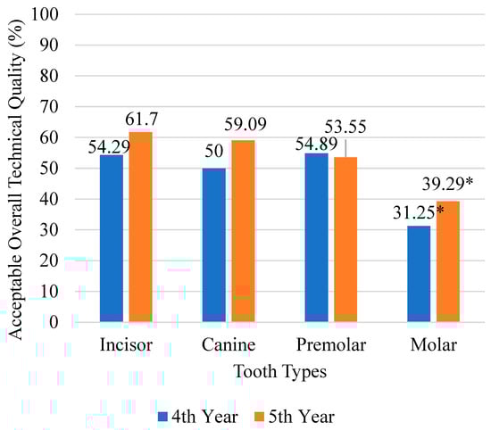 A significant difference was observed in QRCT acceptability across tooth types, with molars exhibiting the lowest acceptability in condensation (n = 133, 66.50%) and extension (n = 138, 69.00%) compared to other teeth (p < 0.001) (Table 4). Anterior teeth (n = 123, 57.48%) demonstrated significantly higher acceptability of root canal fillings than posterior teeth (n = 232, 47.54%) (p = 0.015) (Table 4). Molars showed the lowest QRCT acceptability in both 4th-year (n = 10, 31.25%) and 5th-year predoctoral students (n = 66, 39.29%) (p = 0.016) (Figure 1).