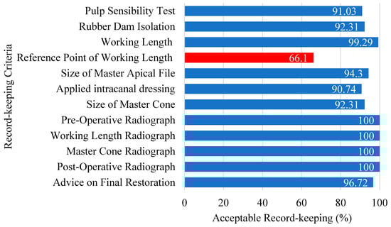 The coronal reference point of the working length was the most frequently omitted criterion in record-keeping. Inadequate documentation of this crucial reference point may lead to the loss of vital information, potentially resulting in underfilling or overfilling of the root canal, thus compromising the QRCT and leading to unsatisfactory endodontic outcomes. However, the absence of a recorded coronal reference point did not significantly correlate with unacceptable extension. This suggests that the omission of documentation does not necessarily reflect a neglect of the concept and application of the coronal reference point by predoctoral students during clinical practice. Pourasghar et al. proposed that the omission of information in medical records may arise from students or clinicians prioritizing certain treatment steps over others, potentially at the expense of documentation completeness [39].