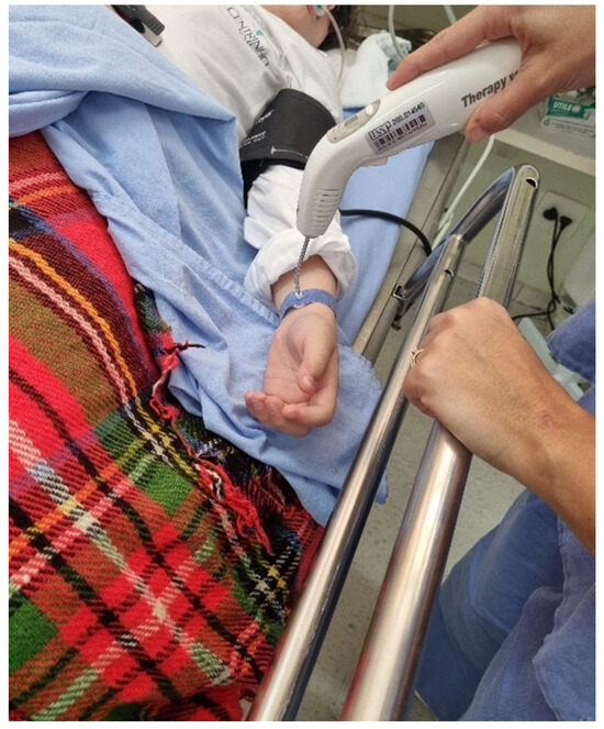 VPBM was administered immediately after surgery by a trained operator (N.R.F) approximately 10 min postoperatively while the patient was still sedated in the surgical center’s recovery room and again 24 h after the procedure in the research room. These procedures were performed using the Laser TherapyEC device (DMC Import and Export of Equipment Ltd., São Carlos, São Paulo, Brazil), which operates in the red spectrum (660 ± 10 nm), with a power output of 100 mW ± 20% in the intravenous laser irradiation of blood (ILIB) mode. The therapy duration was 10 min for patients aged 9–17 years and 15 min for those aged ≥18 years. VPBM was applied to the radial artery of the arm opposite to that used for medication administration using a specialized wristband provided by the device manufacturer. (Figure 1).