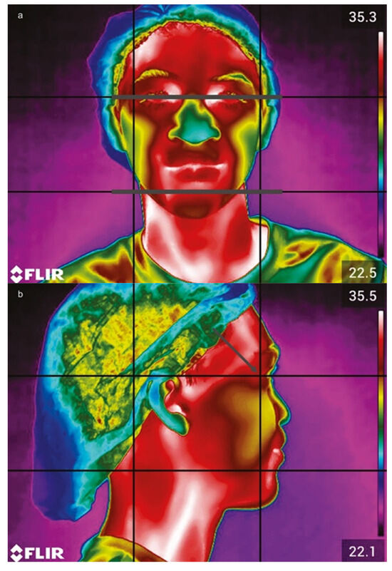 The camera was positioned perpendicularly, 80 cm from the patient’s face, using a tripod. To standardize facial positioning during image capture, a guideboard was made using acetate (8.3 cm × 6.3 cm), with vertical and horizontal lines dividing it into nine rectangles (2.7 cm × 2.1 cm). For frontal images, alignment was based on reference lines corresponding to the field of view and chin region (Figure 2a). For lateral images, guidelines were aligned with the outer corner of the eye to ensure consistency (Figure 2b). Each patient was photographed from frontal, right-side, and left-side perspectives. During the evaluation, patients were instructed to remain still, avoid touching their faces, and refrain from speaking for 15 min to achieve thermal equilibrium.