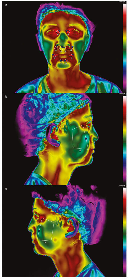 Temperature measurements were performed by a single operator specifically trained for the study, achieving an ICC of 0.868. Each ROI provided an average temperature. The total facial temperature was calculated as the average of all frontal ROIs combined with lateral ROIs at baseline (T0) and 24 h postoperatively (T2).
