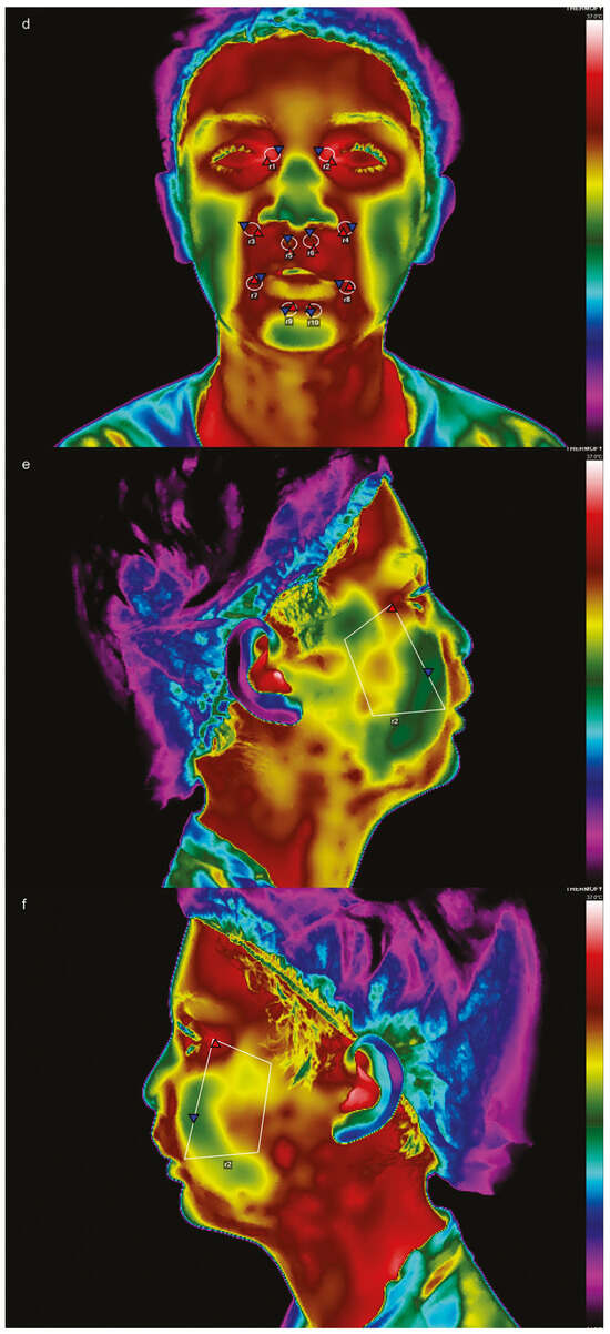 Frontal view in thermographic imaging before (a) and after (d) surgery; side views before (b,c) and after surgery (e,f), with their respective regions of interest (ROIs).